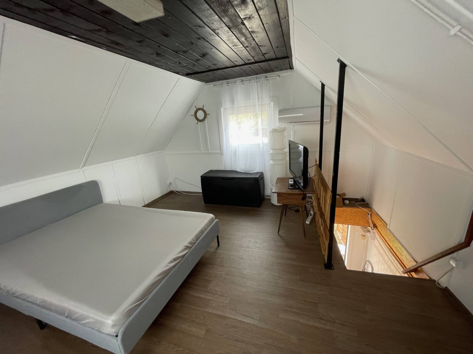 🛋️ Lent kihúzható 2 személyes kanapé, 🛏️ az emeleten franciaágy + pótágy